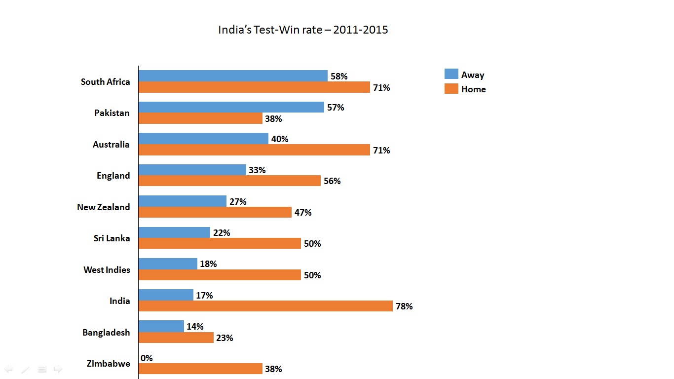 - In the period 2011-15, India have won an amazing 14 Tests in 18 home matches, but have managed only 4 wins out of 23 matches away from home – that puts us at a 78% win rate at home and 17% away, the highest and the lowest across all Test playing nations, barring Zimbabwe and Bangladesh.