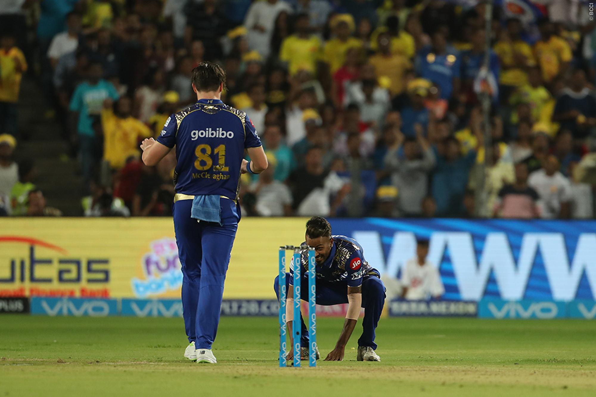 MS Dhoni had come in after the fall of Rayudu’s early and found his rhythm late after he struck a few lusty blows, looking set to finish off the innings once again. But, as fate would have it, he was dismissed on the first ball of the 18th over as he hit a full toss wide outside off-stump straight to deep cover. However, although it was McClenaghan who picked up the wicket, it was Hardik Pandya who celebrated quite wildly.